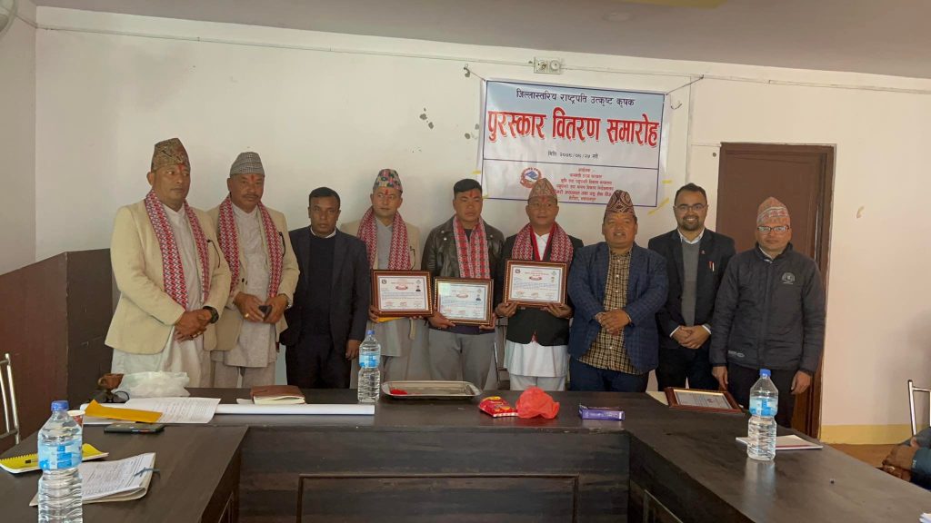 जिल्ला समन्वय समिति मकवानपुर प्रमुख ललित घलान, भेटेरिनरी अस्पताल तथा पशु सेवा विज्ञ केन्द्र हेटौंडा मकवानपुरका निमित्त कार्यालय प्रमुख ब्रज किशोर ठाकुर, पशु विकास अधिकृत डाक्टर आभास कोइरालाले उत्कृष्ट कृषकलाई पुरस्कार तथा कदरपत्र हस्तान्तरण गरेका हुन् ।