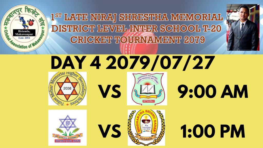 हेटौंडा । हेटौंडा ४ हुप्रचौरमा जारी निरज श्रेष्ठ स्मृति जिल्लास्तरीय अन्तरविद्यालय क्रिकेट प्रतियोगितामा आइतबार भएको दोस्रो खेलमा हेटौंडा एकेडेमी विजयी भएको छ । सिद्धार्थ शिशु सदनलाई ३ विकेटले पराजित गर्दै हेटौंडा एकेडेमी विजयी भएको हो ।