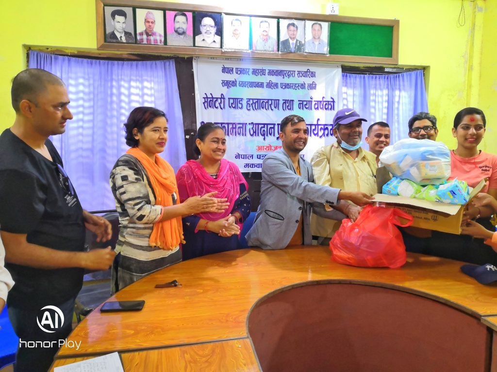 त्यस्तै शुभकामना आदानप्रदान कार्यक्रमको अवसरमा मकवानपुरका महिला पत्रकारहरुलाई सेनेटरी प्याड उपलब्ध वितरण गरिएको छ । नेपाल पत्रकार महासंघ मकवानपुरको आयोजना तथा सञ्चारिका समूह मकवानपुरको व्यवस्थापनमा महिला पत्रकारहरुलाई सेनेटरी प्याड उपलब्ध गराइएको हो ।