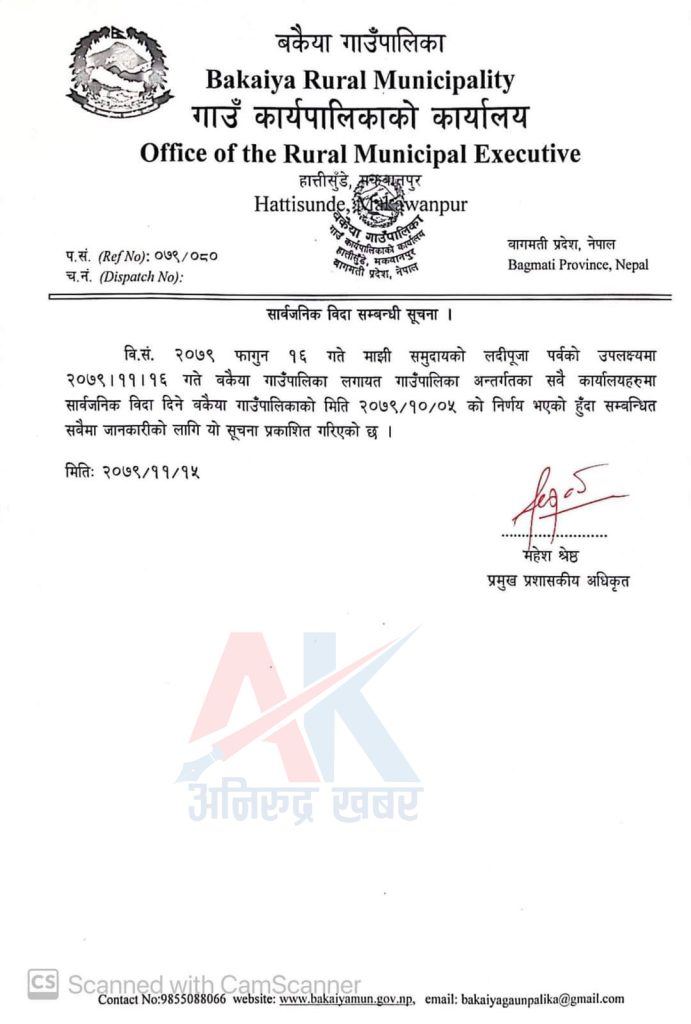सोमबार सूचना सार्वजनिक गर्दै पालिकाले बकैया गाउँपालिका लगायत पालिकाका कार्यालयहरु बन्द हुने जनाएको छ । त्यस्तै बागमती गाउँपालिकाले पनि भोलि सार्वजनिक बिदा दिने निर्णय गरेको छ ।
