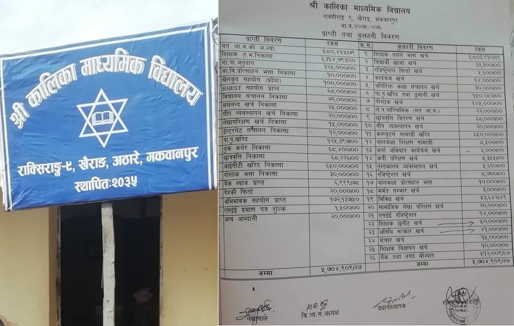 अति गरिब तथा विपन्न चेपाङ तथा तामाङ परिवारका बालबालिका पढ्ने राक्सिराङ–९ खैराङ, अठारेमा रहेको कालिका माध्यमिक विद्यालयले वडाध्यक्ष र अन्य विशिष्ट व्यक्तिहरू आउँदा रक्सी र चुरोट किनेको खर्च अडिट गरेर उठाइसकेको खुलेको छ ।
