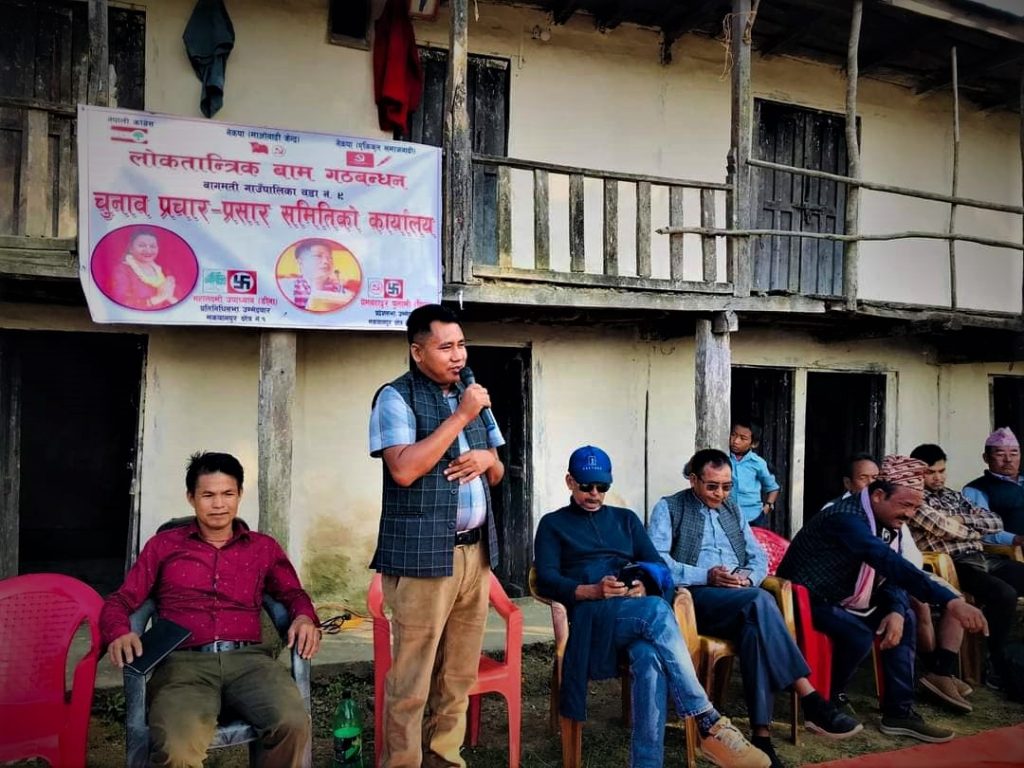 उनले सार्वजनिक रुपमै निर्वाचन आचार संहिता बिपरित भोट मागेका हुन् । बागमती गाउँपालिका वडा नं.९ बेतिनीमा बाम लोकतान्त्रिक गठबन्धनको चुनाव प्रचार–प्रसार कार्यालय उद्घाटन कार्यक्रममा बाग्मती गाउँपालिकाका अध्यक्ष घलानले भोट मागेका हुन् ।