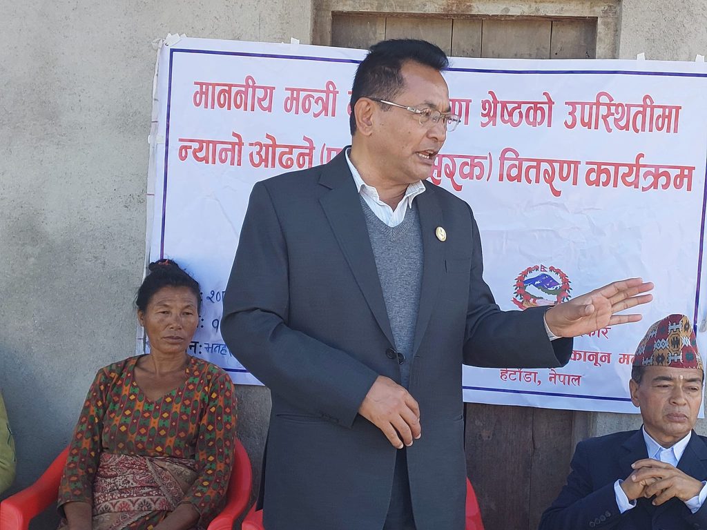‘सबैलाई संविधानले बराबरी अधिकार दिएको छ, संविधानतः सरकारले सबैलाई समान व्यवहार गर्नुपर्छ,’–मन्त्री श्रेष्ठले भने । आर्थिक रुपमा विपन्न, लोपोन्मुख, सिमान्तकृत समुदायहरुलाई सरकारले विशेष अभिभावकत्व प्रदान गर्नुपर्नेमा उहाँले जोडदिए । बागमती प्रदेशभित्र बसोबास गर्ने लोपोन्मुख, वनकरीया, हायू र अति सीमान्तकृत जातीलाई जाडोमा उहाँहरूको घरमा न्यानो भित्रियोस् भनेर तातो ओड्ने फाइबर सिरक वितरण गरिएको उनले स्पष्ट पारे ।