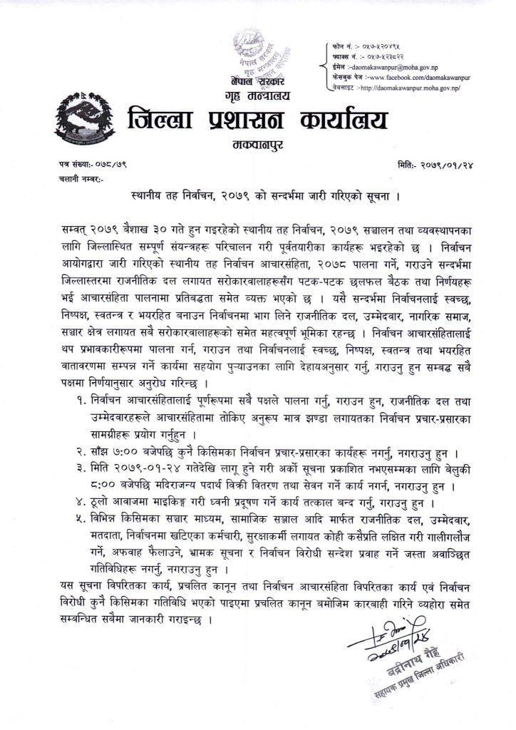 हेटौंडा । जिल्ला प्रशासन कार्यालय मकवानपुरले निर्वाचन आचारसंहितालाई पूर्ण रूपमा सबै पक्षले पालना गर्न निर्देशन दिएको छ ।