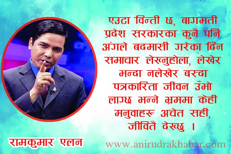 राजनीतिक संगठनलाई रकम छुटयाउँदा प्रदेश पत्रकारिता मर्छ भन्ने प्रमाणहरु जुटेका दिन कठघरामा उभिन म तयारै छु । जब लोकहितमा काम गर्दा लखेटिन्छ भने त्यतिखेर भन्नैपर्छ, एउटा सनकमा खोलिएका निजी मिडियाहरुहरु राष्ट्रिय हुने र तिनै मिडियामा कार्यरतहरु संगठित भएको टे«ड युनियन आन्दोलनसँग जोडिएको संगठनहरु कसरी गलत हुन्छ ? परिभाषा उल्टो कि परिभाषा पढाउनेहरु उल्टो ? एउटा विन्ती छ, बागमती प्रदेश सरकारका कुनै पनि अंगले बदमासी गरेका दिन समाचार लेख्नुहोला, लेखेर भन्दा नलेखेर बस्दा पत्रकारिता जीवन उँभो लाग्छ भन्ने भ्रममा केही मनुवाहरु अचेत सही, जीवितै देख्छु ।