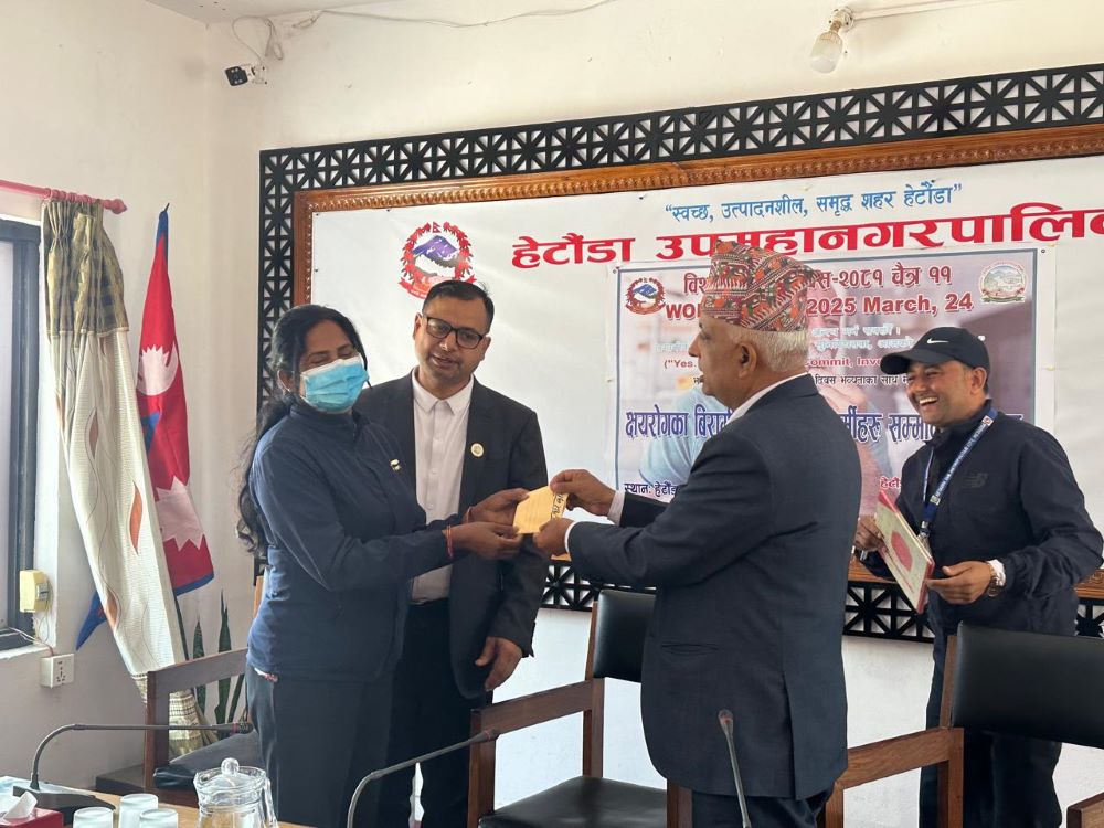 हेटाैँडा । बिश्व क्षयरोग दिवस ‘मार्च २४’ को अवसरमा हेटौंडा उपमहानगरपालिका क्षेत्रमा रहेर नियमित औषधि सेवन गरीरहेका १० जना बिरामीलाई सम्मान गरीएको छ ।