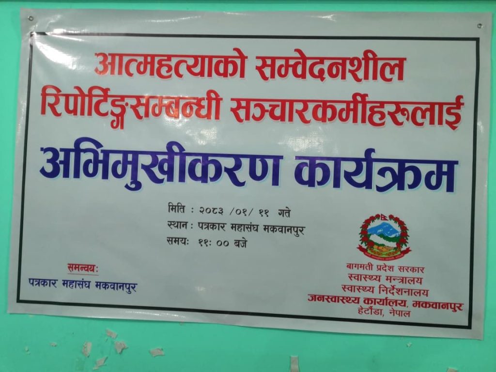 जनस्वास्थ्य कार्यालय मकवानपुरले शुक्रबार मकवानपुरका सञ्चारकर्मीहरूसँग “आत्महत्या सम्बन्धी संवेदनशील रिपोर्टिङ” विषयमा आयोजना गरेको अभिमुखीकरण कार्यक्रममा यस्तो जानकारी दिइएको हो । कार्यक्रममा सहभागीहरूले खेलकुद तथा मनोरञ्जनात्मक क्रियाकलापमा संलग्न भई तनाव कम गर्न सकिने बताएका थिए ।
