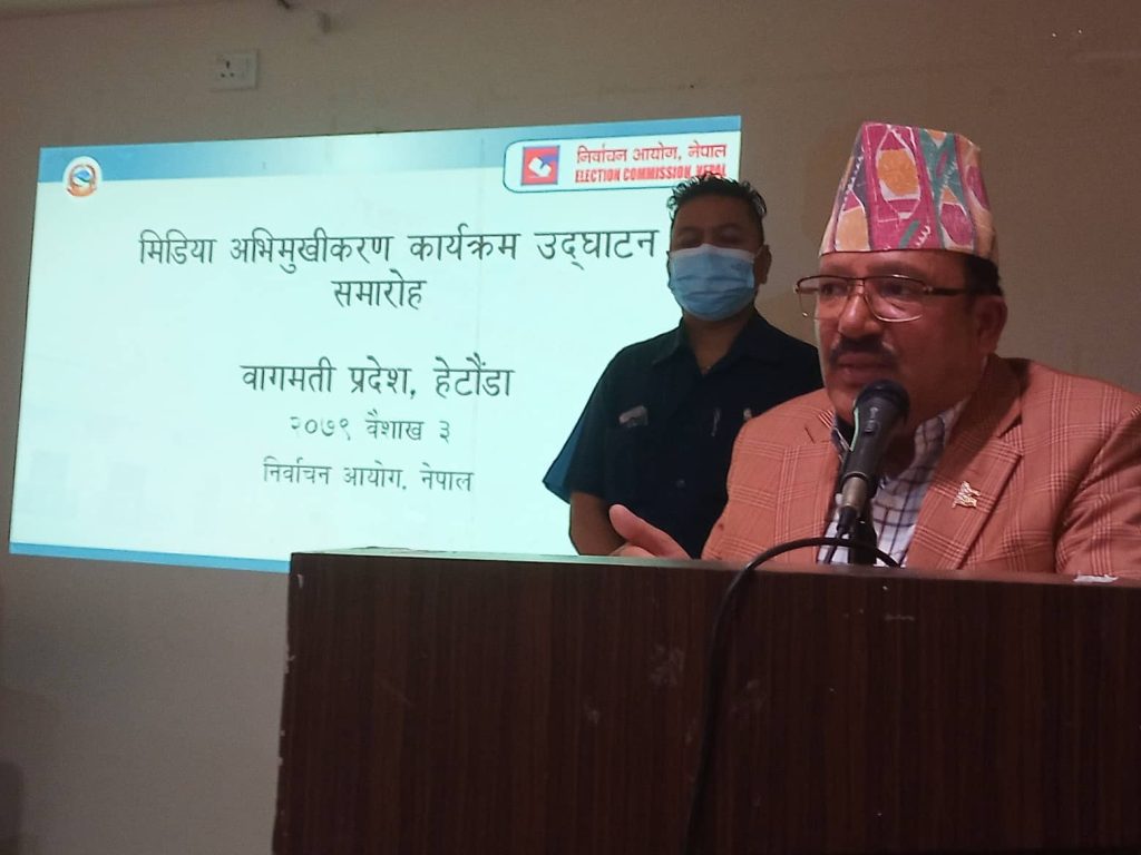 निर्वाचन आयोगको कार्यालयले शनिबार हेटौंडामा आयोजना गरेको मिडिया अभिमुखिकरणा कार्यक्रममा बोल्दै बैशाख ३० गते हुने स्थानीय तहको निर्वाचन तोकिएकै मितिमा सम्पन्न हुने कुरा प्रष्ट पारेका हुन् ।